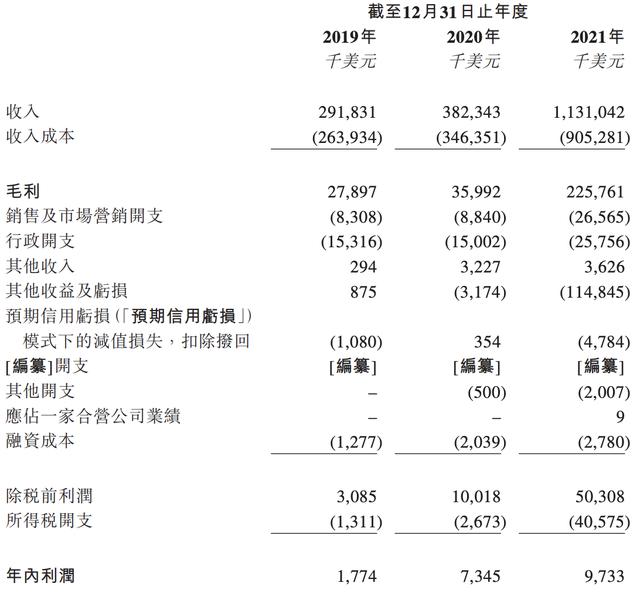 据此前招股书披露,德威集团2019年、2020年和2021年的收入分别为2.92亿美元、3.82亿美元和11.31亿美元,毛利分别为2789.7万美元、3599.2万美元和2.26亿美元,净利润分别为177.4万美元、734.5万美元和973.3万美元。