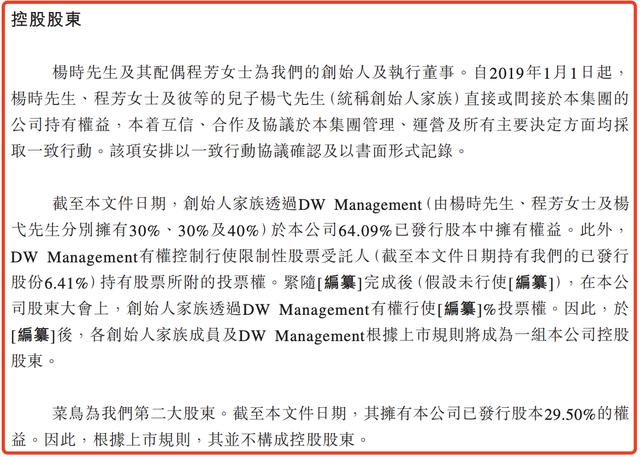 相比之下,德威集团创始人家族通过DW Management(由杨时、程芳及杨弋分别拥有30%、30%及40%)于该公司64.09%已发行股本中拥有权益。其中,杨时、程芳均为德威集团创始人、执行董事,杨弋为二人之子。