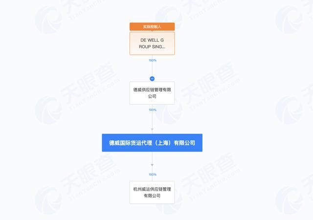 天眼查App显示,德威国际货运代理(上海)有限公司成立于2007年6月。目前,该公司的注册资本为5000万元,法定代表人为程芳,全资股东为德威供应链管理有限公司,后者由DE WELL GROUP SINGAPORE PTE.LTD.全资控股。