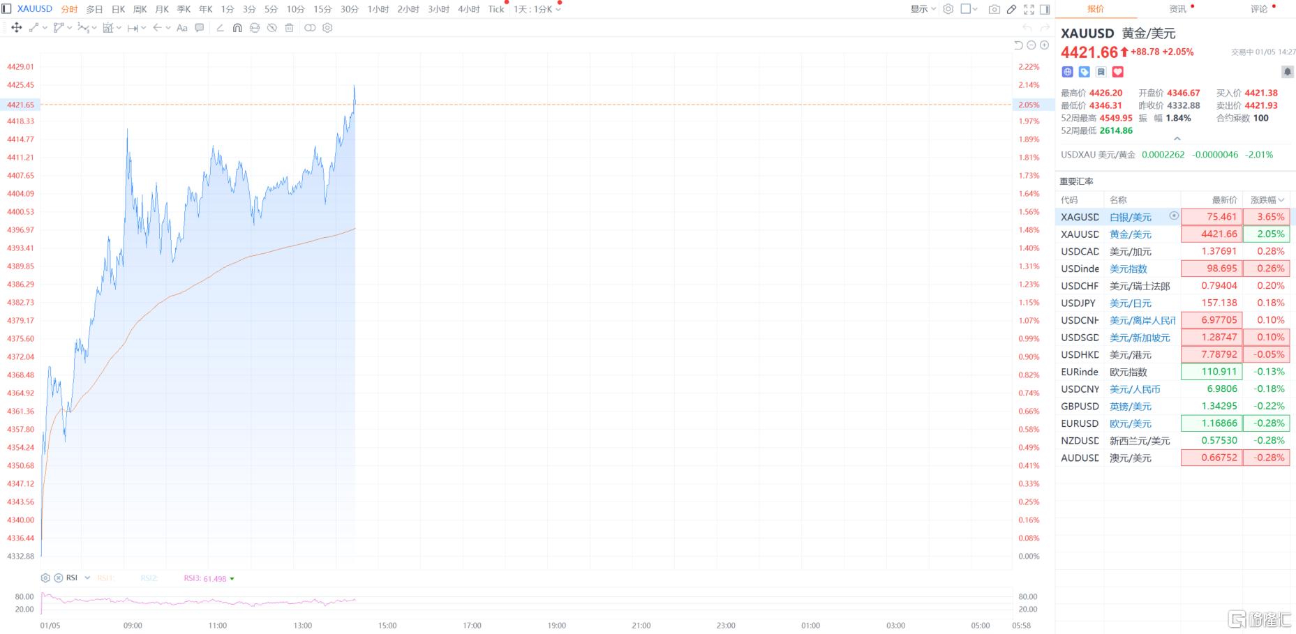 现货黄金现涨约2%报4421美元/盎司,白银价格则暴涨近4%至75.57美元/盎司,铂金和钯金价格也均出现上调。