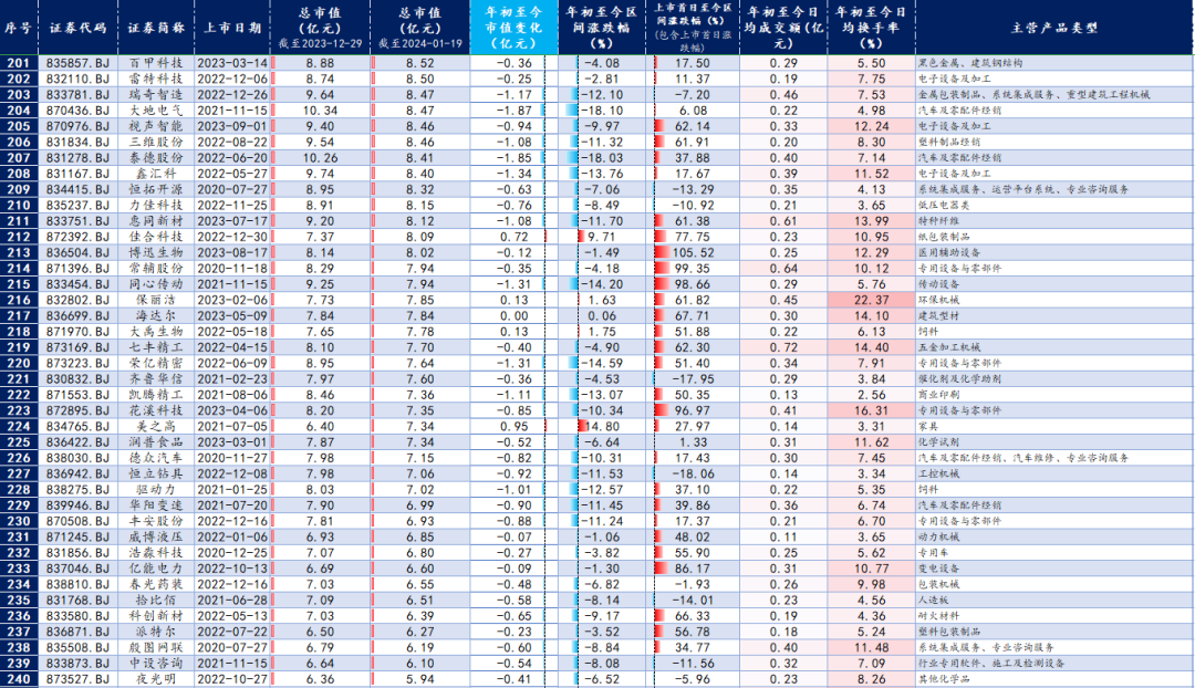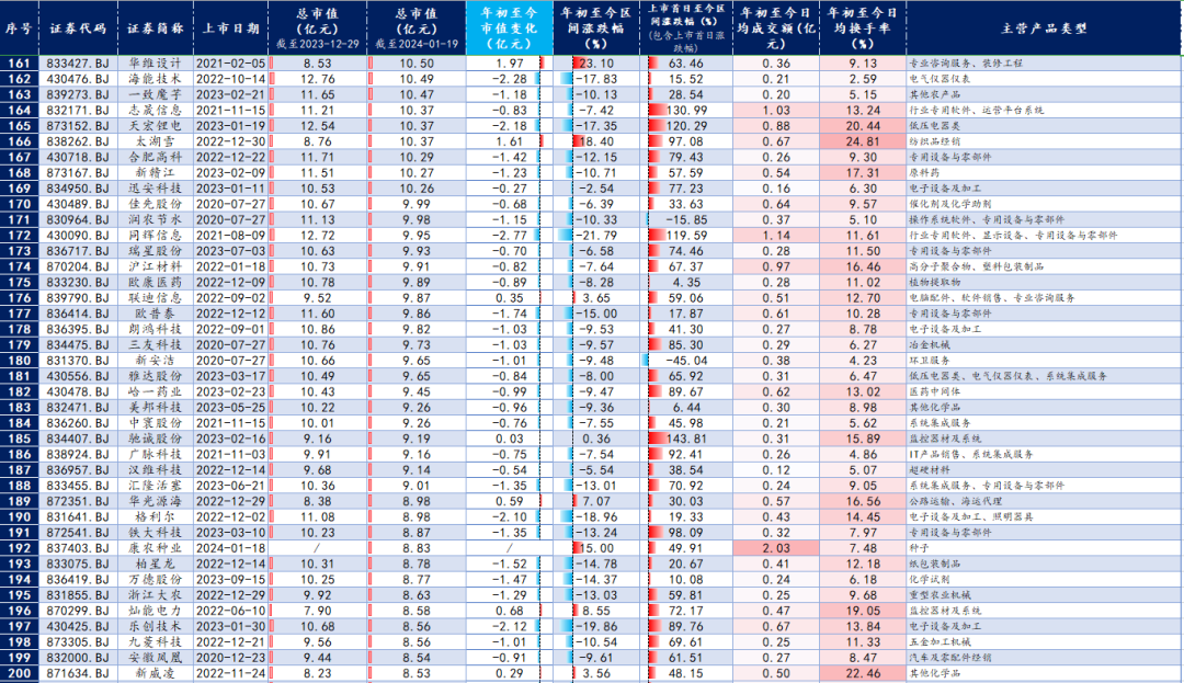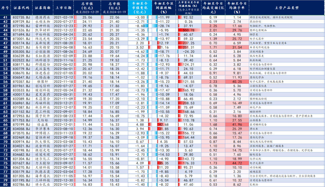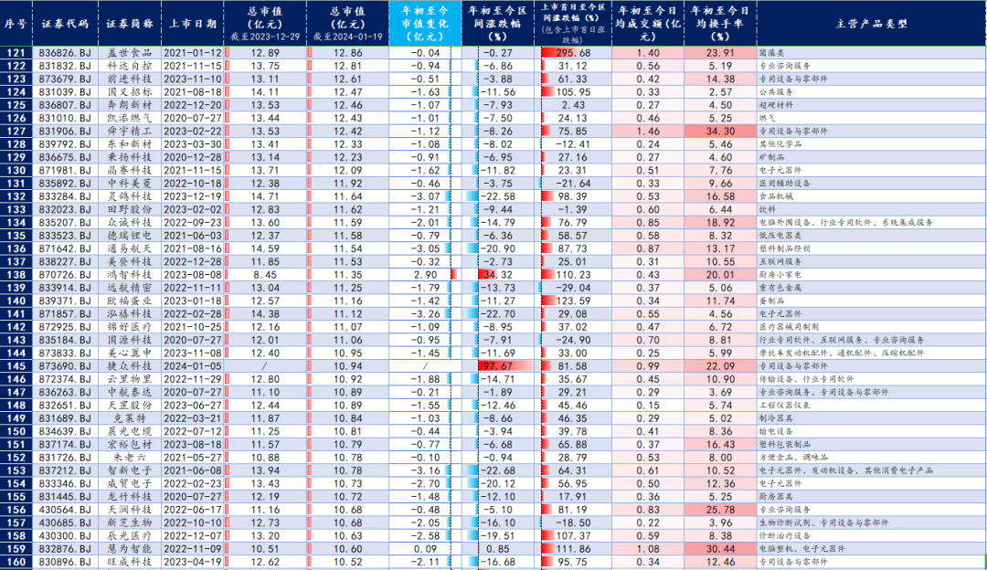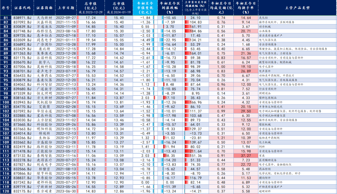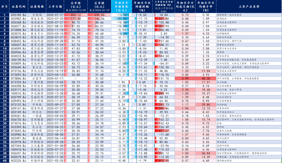 截至1月19日,北交所上市公司中仅有20家市值超过30亿元(2023年末为24家)。