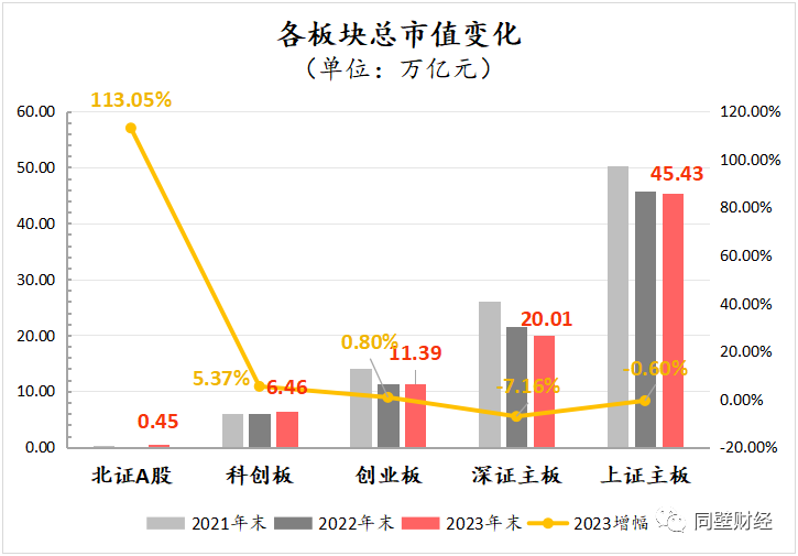 板块总市值方面,根据我们之前的统计:截至2023年末,北证A股总市值为4496.41亿元(2022年末为2110.29亿元),较2022年末总市值增长113.05%,同期科创板、创业板、上证主板、深证主板相对去年末增幅分别为5.37%、0.80%、-0.60%、-7.16%。