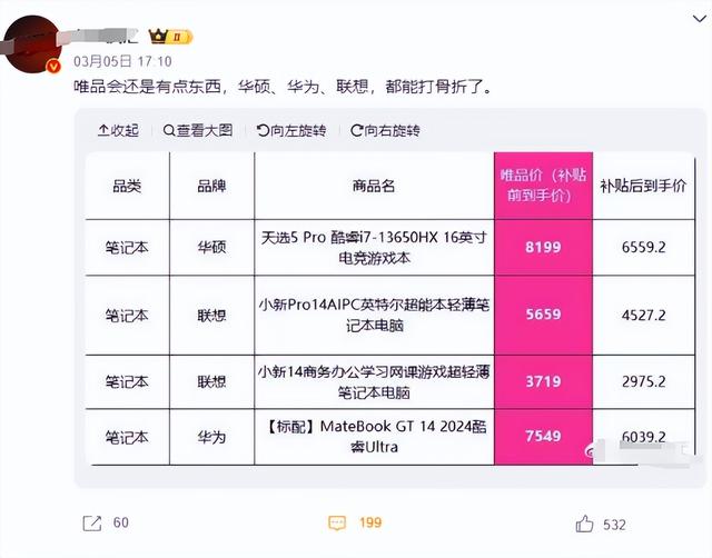 有网友注意到,现在的唯品会上不仅有耐克、阿迪打3折,联想、华硕等品牌电脑,在国补补贴以及平台折扣下极具性价比。比如联想小新Pro14 AI超能本原价5659元,补贴后仅4527元;华硕天选5 Pro原价8199元,补贴后6559元;华为MateBookGT14原价7549元,补贴后约6039元。