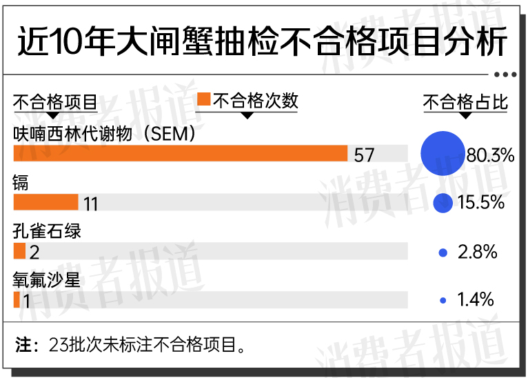 《消费者报道》分析不合格项目发现,抽检不合格大闸蟹共涉及4项:呋喃西林代谢物、镉、孔雀石绿、氧氟沙星。其中违规使用呋喃西林导致大闸蟹体内药物残留超标是不合格之最,该项目检出不合格57次,占不合格比例超过8成。其次为重金属镉超标,也有11次,大闸蟹作为甲壳类动物,重金属容易在其体内积累。
