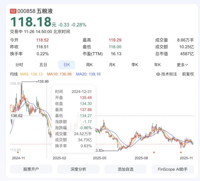 2024年12月31日收盘,五粮液收盘价134.30元/股,截至2025年11月26日撰稿,五粮液股价已经下滑至118.20元/股,下滑了11.99%。在此背景下,五粮液投资某半导体公司,试图以“白酒+高科技”的跨界模式打开增长空间。但从公司自身储备的对策与投资数据来看,这一战略的实际价值值得商榷。