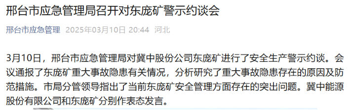煤矿重大事故隐患一向是监管重点,这些隐患不仅严重威胁矿工的生命安全,也对社会稳定和经济发展造成负面影响。今年3月,邢台市应急管理局还对东庞矿进行了安全生产警示约谈。早在去年中旬,国家矿山安全监察局河北局就2024年以来发生顶板事故以及瓦斯超限、底板突水等涉险事故多发情况对冀中能源主要负责人、分管负责人开展过警示约谈。