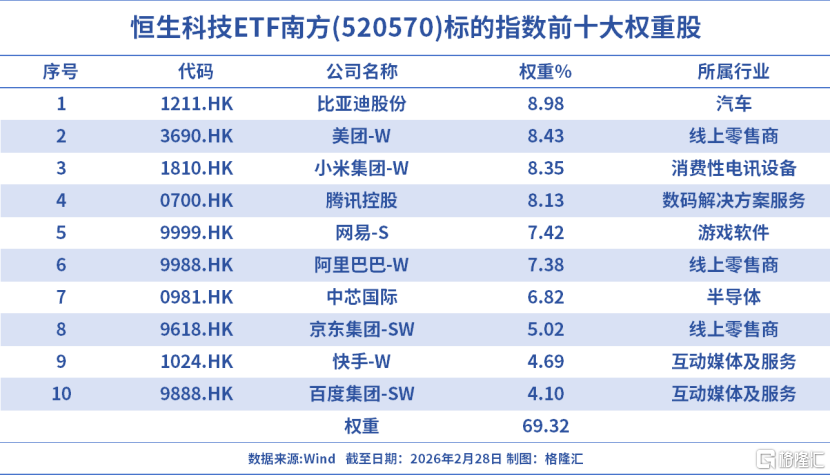 恒生科技ETF南方(520570)及联接基金(A类:020988C类:020989)跟踪恒生科技指数,一键打包中国科技核心资产,标的指数中美团-W、阿里巴巴-W、京东集团-SW合计占比20.83%