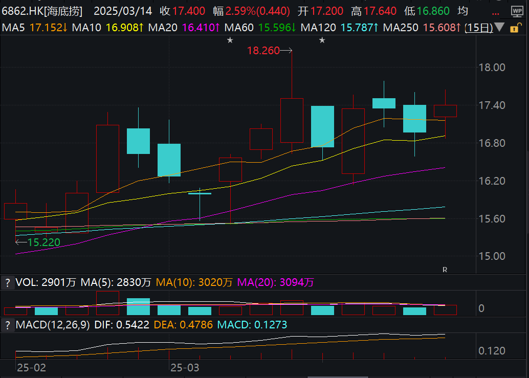 3月14日,海底捞的股价以上涨2.59%报收17.40港元,公司市值增至约970亿港元,已超过了“小便事件”曝光前的公司市值。