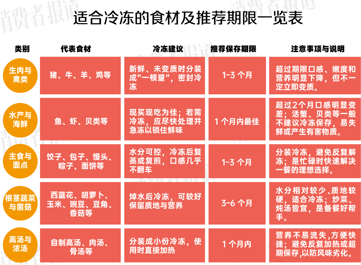 刘丽梅表示,生肉、海鲜、主食、根茎类蔬菜以及高汤等食材,在合理期限内冷冻,能最大程度保留风味与营养。下表梳理了适合冷冻的五大类食材及其操作建议与保存期限:
