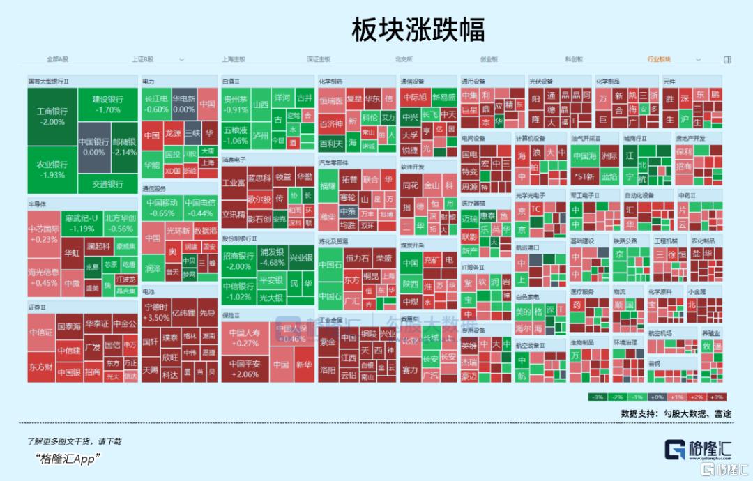 板块方面,能源金属、光伏设备、有色金属、非金属材料、贵金属、小金属、电池、玻璃玻纤、多元金融、证券板块涨幅居前,银行、船舶制造板块跌幅居前。