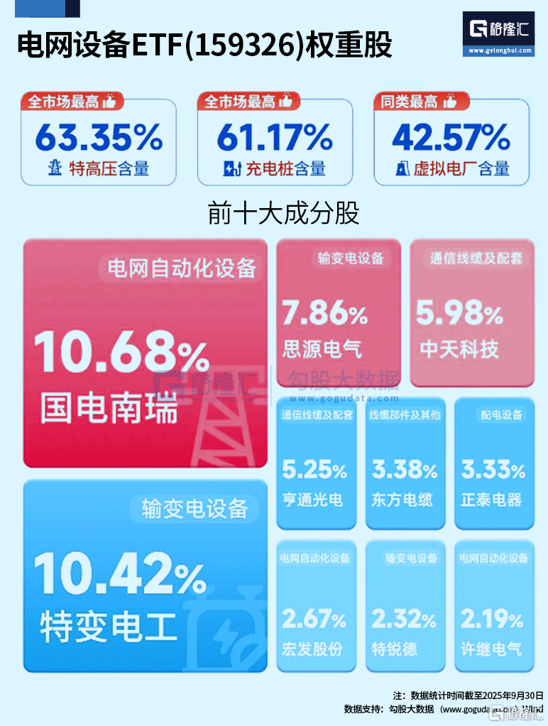 电网设备ETF(159326)是全市场唯一跟踪中证电网设备主题指数的ETF,成份股特高压权重占比高达63.35%,充电桩含量61.17%,全市场最高;虚拟电厂含量42.57%,同类指数最高;前十大重仓股中囊括了国电南瑞、特变电工、思源电气、中天科技等行业龙头。