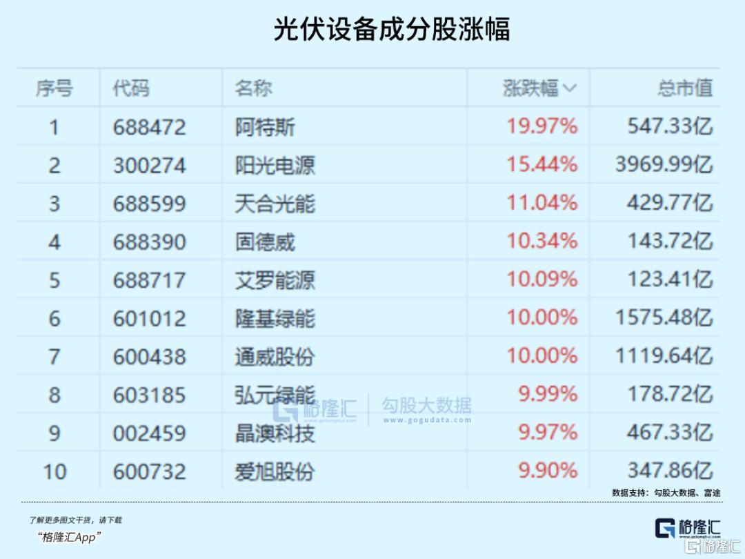 具体来看,光伏、储能概念震荡拉升,多只龙头股表现强势,阿特斯20CM涨停,阳光电源涨超15%,市值一度站上4000亿。隆基绿能、通威股份、晶澳科技等涨停,双良节能、TCL中环、大全能源等涨幅居前。