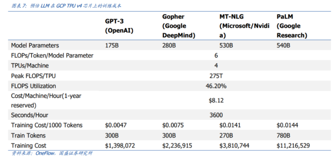 国盛证券基于参数数量和token数量估算,GPT-3训练一次的成本约为140万美元;一些更大的LLM模型,训练成本则介于200万美元至1200万美元之间。