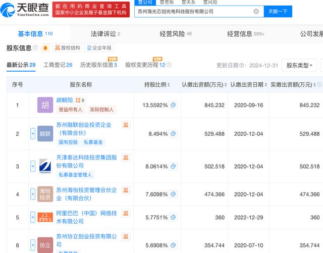 天眼查App信息显示,苏州海光芯创光电科技股份有限公司成立于2011年11月,至今已有14年。目前,该公司的注册资本为7611.0545万元,法定代表人为胡朝阳,主要股东包括胡朝阳、泰达科技、阿里巴巴、小米等。