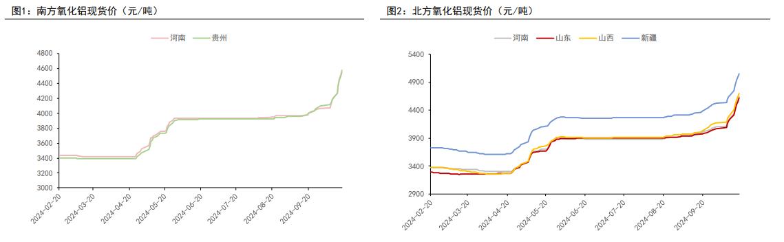 现货方面,在过去的一周,各地区氧化铝现货价格维持加速上涨趋势,广西、贵州、河南、山东、山西、新疆地区现货价格分别上涨360元/吨、350元/吨、385元/吨、365元/吨、380元/吨、380元/吨。氧化铝流通现货紧张局面持续。