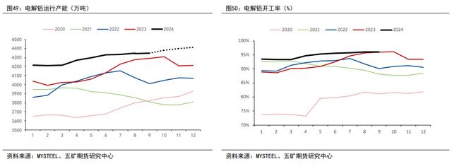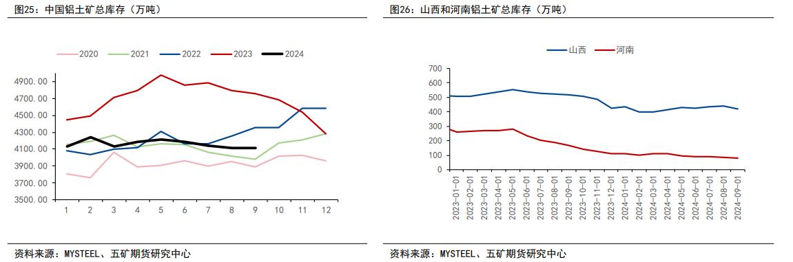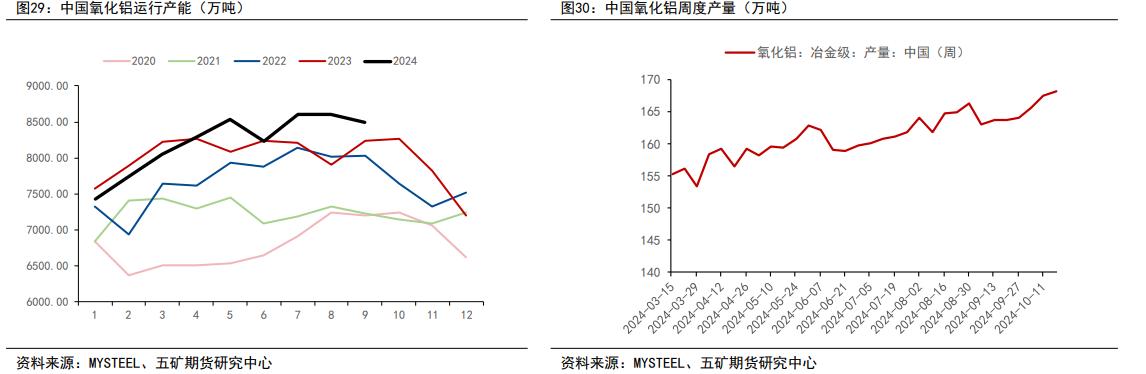 需求端,运行产能方面,2024年9月电解铝运行产能4348.83万吨,较上月增加0.5万吨。据Mysteel统计,10月份信发集团新疆准东电解铝置换项目启动预计带来增量23万吨左右,四季度贵州、四川、青海等地仍有投产,以及四季度电解铝产能增量为54.5万吨,带来氧化铝消费增量约105万吨。此外,南方电网透露今年枯水季云南电解铝企业不再限电,氧化铝需求支撑进一步加强。