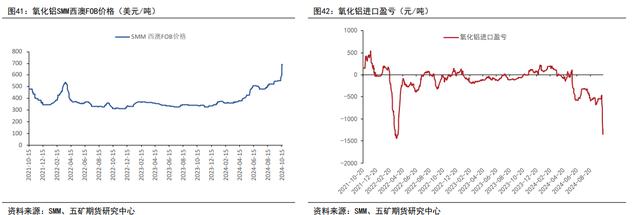 截止10月18日,西澳氧化铝FOB价格报693美元/吨,较上周上涨118美元/吨,进口盈亏报-1242元/吨,海外氧化铝供应紧缺程度加剧,出口窗口打开,预期国内氧化铝出口量将逐步增加。