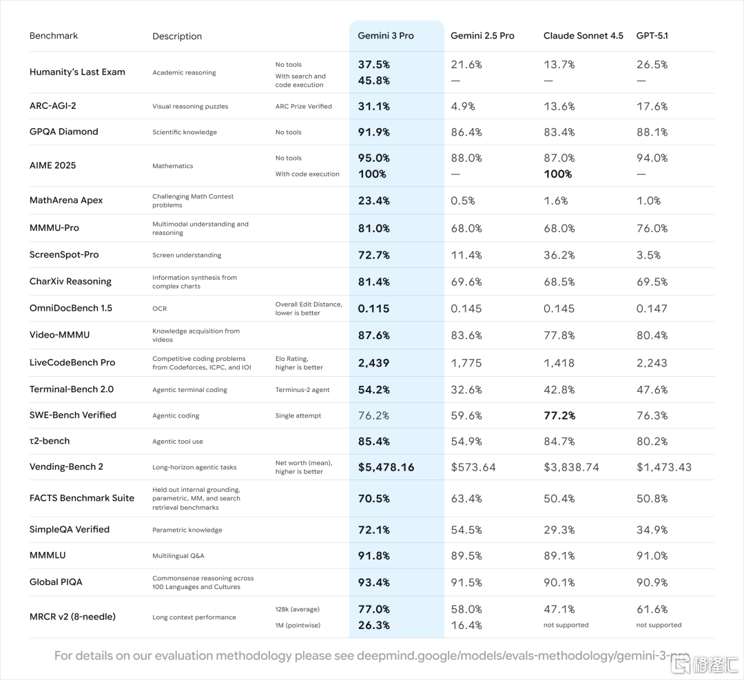 值得一提的是,Gemini 3 Pro的model card在发布之前就已经泄漏了,上面有Gemini 3 Pro在主流benchmark上的评测结果。