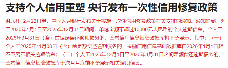 中国人民银行发布关于实施一次性信用修复政策有关安排的通知。通知提到,对于2020年1月1日至2025年12月31日期间,单笔金额不超过10000元人民币的个人逾期信息,个人于2026年3月31日(含)前足额偿还逾期债务的,金融信用信息基础数据库将不予展示。
