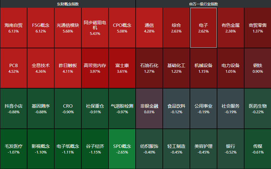 分行业来看,通信、综合、电子、有色金属、商贸零售等行业领涨,传媒、银行、美容护理等行业领跌。