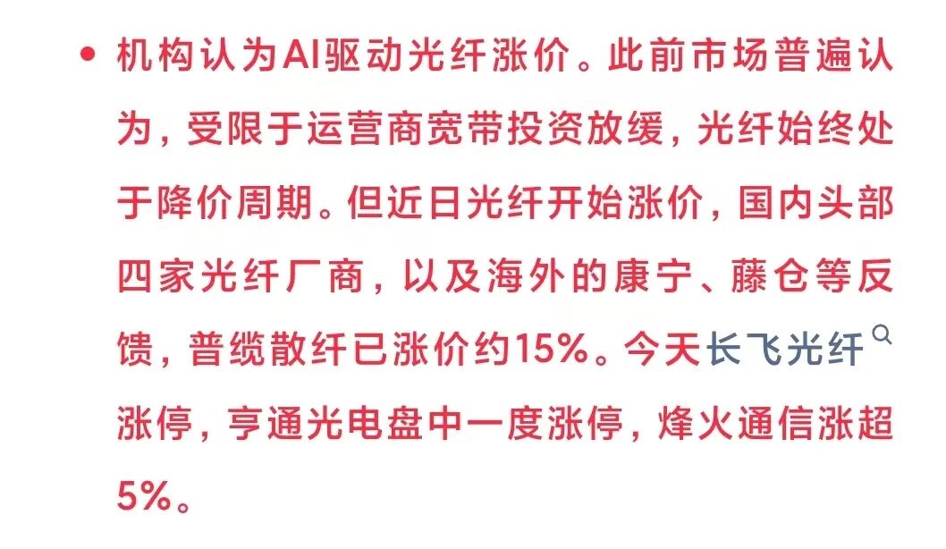上周提示大家,光纤开始走涨价反转逻辑,特别是出口海外数据中心的,今天光纤板块再度暴涨,长飞光纤、亨通光电涨停,中天科技涨超7%。
