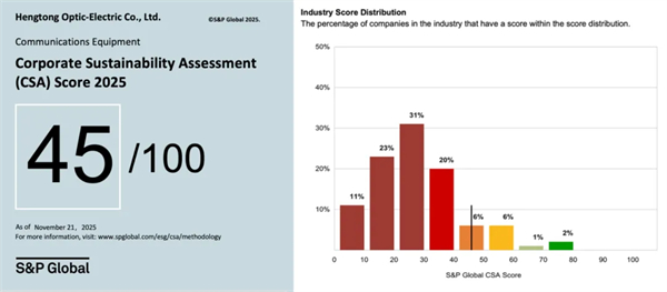 近日,全球最具影响力的可持续发展评价体系之一——标普全球企业可持续发展评估(S&P Global Corporate Sustainability Assessment,简称S&P CSA)正式发布最新ESG评估结果,亨通光电以45分的综合表现,领先全球行业标杆。这一成绩是亨通光电继MSCI ESG评级成功升至BBB后,在国际双权威评价体系中再次获得的高度认可,充分展示了在绿色低碳转型、任供应链责任、公司治理与创新管理等领域的系统化能力与全球竞争力。
