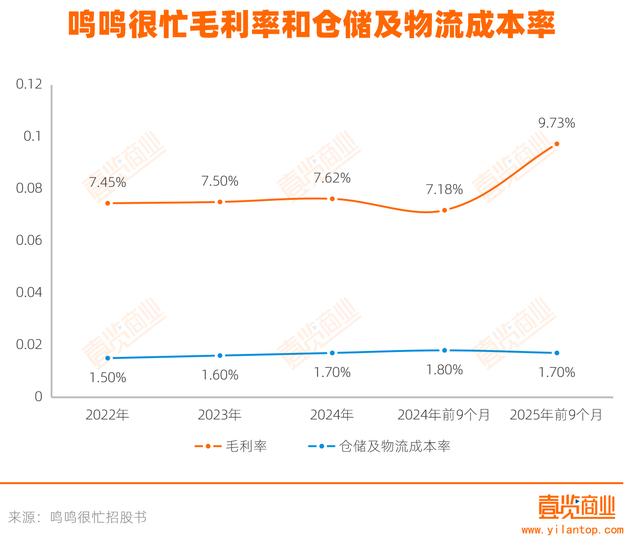 后端,通过对仓储物流环节的精细化管理,将仓储及物流成本率控制在总收入的1.5%—1.8%,处于行业优势水平。这意味着,在其他条件相同的情况下,鸣鸣很忙单店需要分摊的固定履约成本减少,能获得更高的利润,为门店扩张提供支撑,也为毛利增长提供空间。