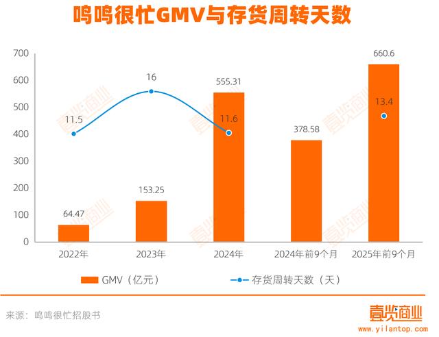 从资产的运营效率看,尽管鸣鸣很忙的GMV从2022年64.47亿元飙升至2025年前9个月的660.60亿元、店均订单数从385单增长至481单,但其存货周转天数却始终稳定在11至13.4天的水平。