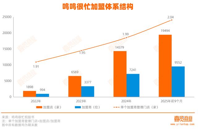 高效的运营体系最终沉淀为稳固的加盟体系。鸣鸣很忙的加盟店从2022年末的1898家,增长至2025年前9个月的19494家;加盟商也从994位增至9552位,说明其商业模式得到认可;加盟商平均管理门店数持续提升,从2022年的单个加盟商管理1.91家门店,上升至2025年前9个月的2.04家,反映出鸣鸣很忙的标准化运营体系趋于成熟,能够有效支撑加盟商实现跨店、跨区域管理。