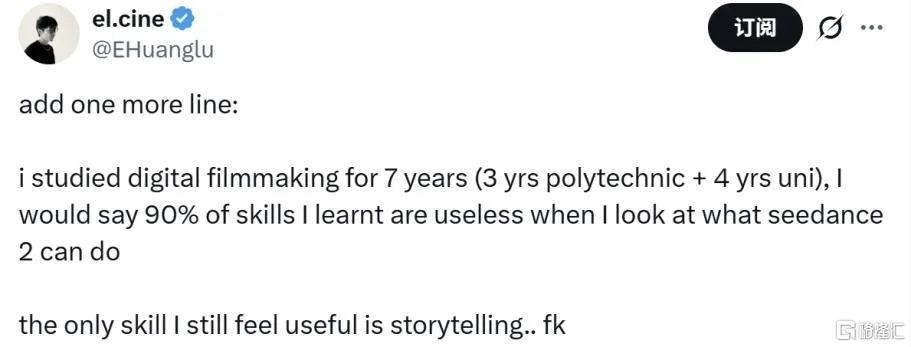 AI影视创意内容领域最为活跃的创作者之一“el.cine”发文感慨:“学了7年数字电影制作,现在感觉90%都白学了。”