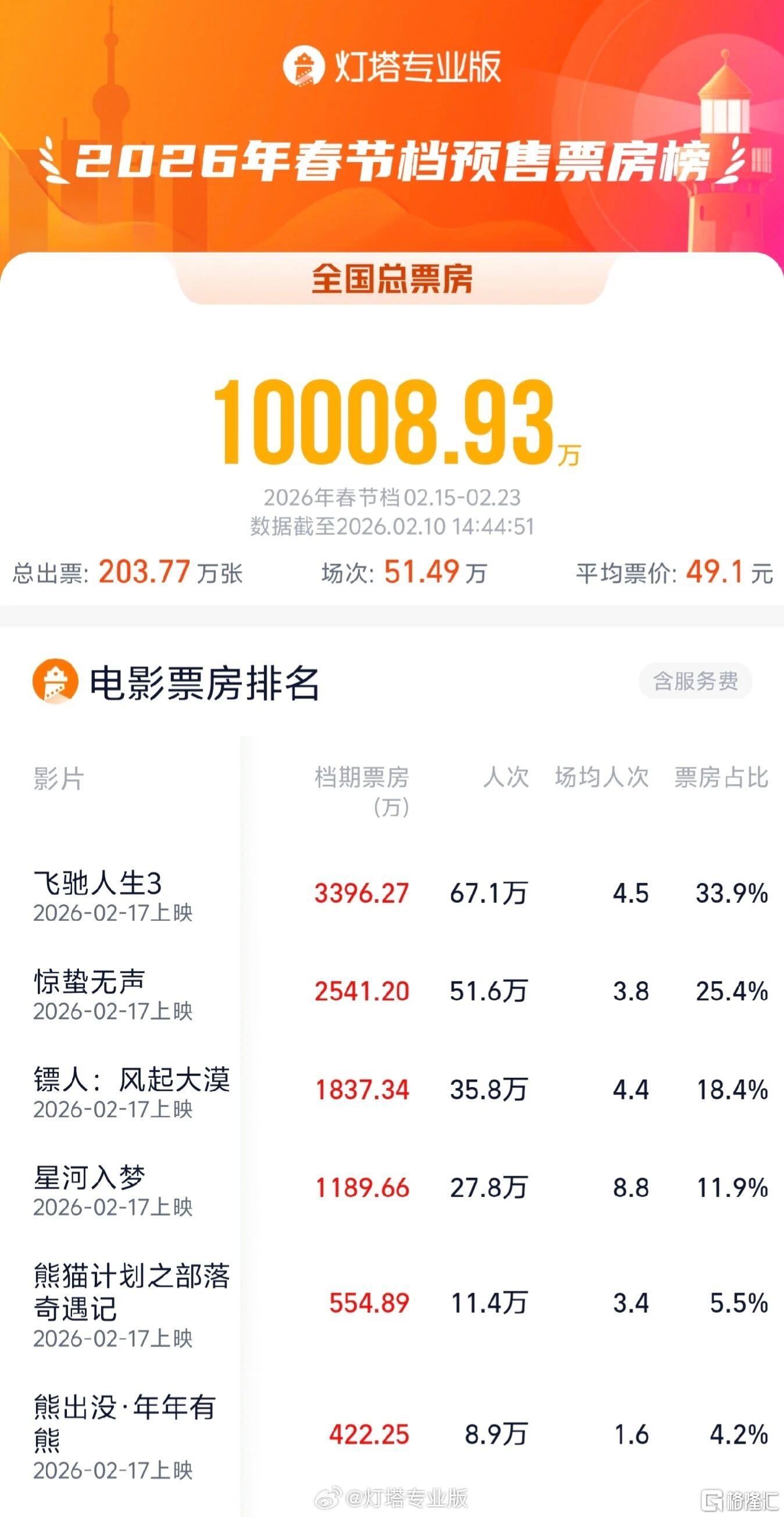 据灯塔专业版,截至2月10日14点44分春节档预售总票房破1亿。其中《飞驰人生3》预售票房突破3300万元位列春节档预售榜首,《惊蛰无声》《镖人:风起大漠》位列其后。