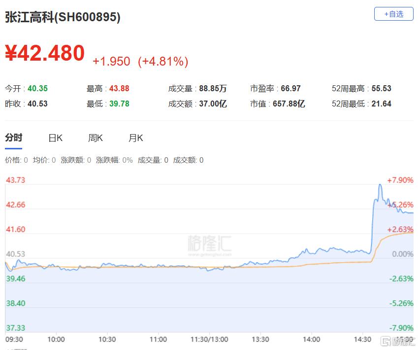 张江高科尾盘拉升涨近5%报42.48元。