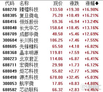 半导体股多数上涨,臻镭科技、复旦微电涨超16%,恒烁股份、长光华芯、成都华微、长川科技等跟涨。