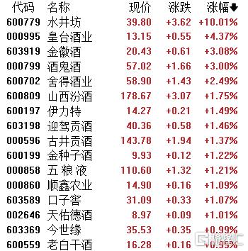 白酒股快速拉升,水井坊涨停,皇台酒业、金徽酒、酒鬼酒、舍得酒业、山西汾酒、五粮液等跟涨。