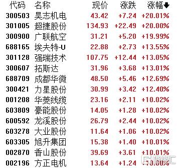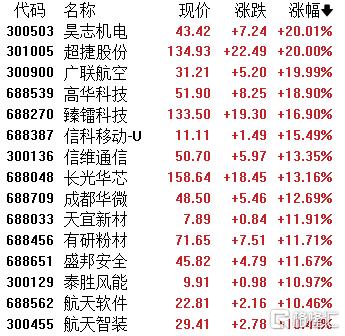 商业航天板块再掀涨停潮,昊志机电、超捷股份、广联航空20CM涨停,长光华芯、成都华微、天宜新材、有研粉材等多股跟涨。