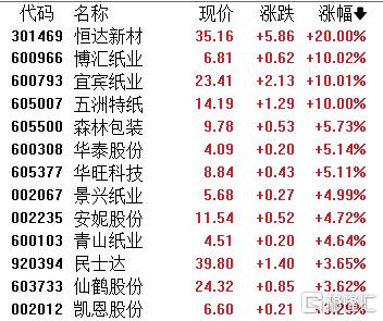 造纸板块拉升,恒达新材、博汇纸业、宜宾纸业、五洲特纸涨停,森林包装、华泰股份、华旺科技等跟涨。