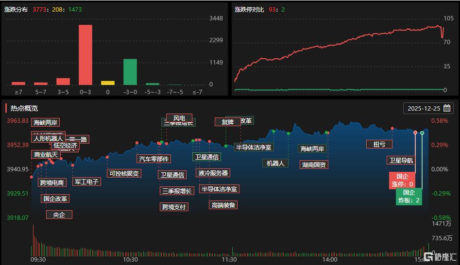 12月25日,A股主要指数集体上涨,沪指涨0.47%报3959点,录得7连涨;深证成指、创业板指录得5连涨,深证成指涨0.33%,创业板指涨0.3%。沪深两市成交额1.92万亿,较上一个交易日放量443亿。近3800股上涨。