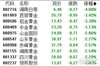 贵金属板块下挫,湖南白银跌4%,西部黄金、招金黄金、中金黄金、山金国际、山东黄金等跟跌。