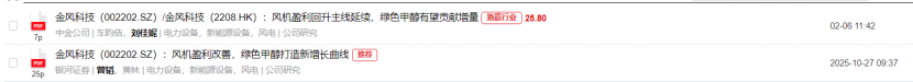 其中,金风科技将绿色甲醇作为公司“新的增长曲线”,绿醇总产能规划超200万吨,其绿色甲醇业务有望自2026年开始为公司贡献业绩增量,目前已与国际航运巨头马士基、赫伯罗特签订供货协议,随着内蒙古兴安盟绿色甲醇一期项目逐步达产(一期预计年度产能25万吨),二期及三期合计145万吨产能也将逐步落地,目前公司已锁定马士基50万吨长单,绿醇现货价达820美元/吨(约合人民币5946元),按照100万吨产能达产测算,预计可为公司贡献60亿收入,占2027年预测收入960亿的6.3%。
