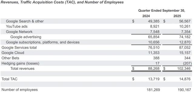 从五年前的500亿美元季度营收到如今的1020亿美元,五年内实现了翻倍,展现出大型科技公司罕见的持续增长能力,是谷歌各业务板块协同增长的结果。