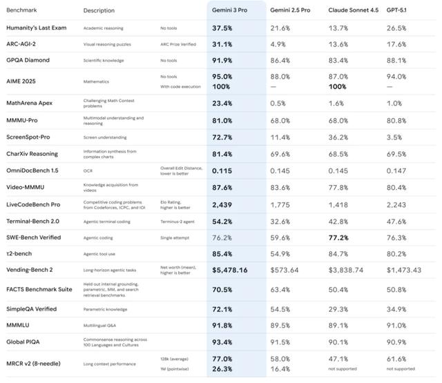 1020亿美元的季度营收、16%的同比增长,各条业务线均取得不俗业绩的情况下,向来在海外被AWS云服务压制的谷歌云取得34%的爆发式增长。新发布的Gemini 3在多个独立测试基准中击败GPT-5登顶榜首,无论是在海外还是在国内,都有不少的使用体验发布,均显示出其在实际场景中的性能和表现。