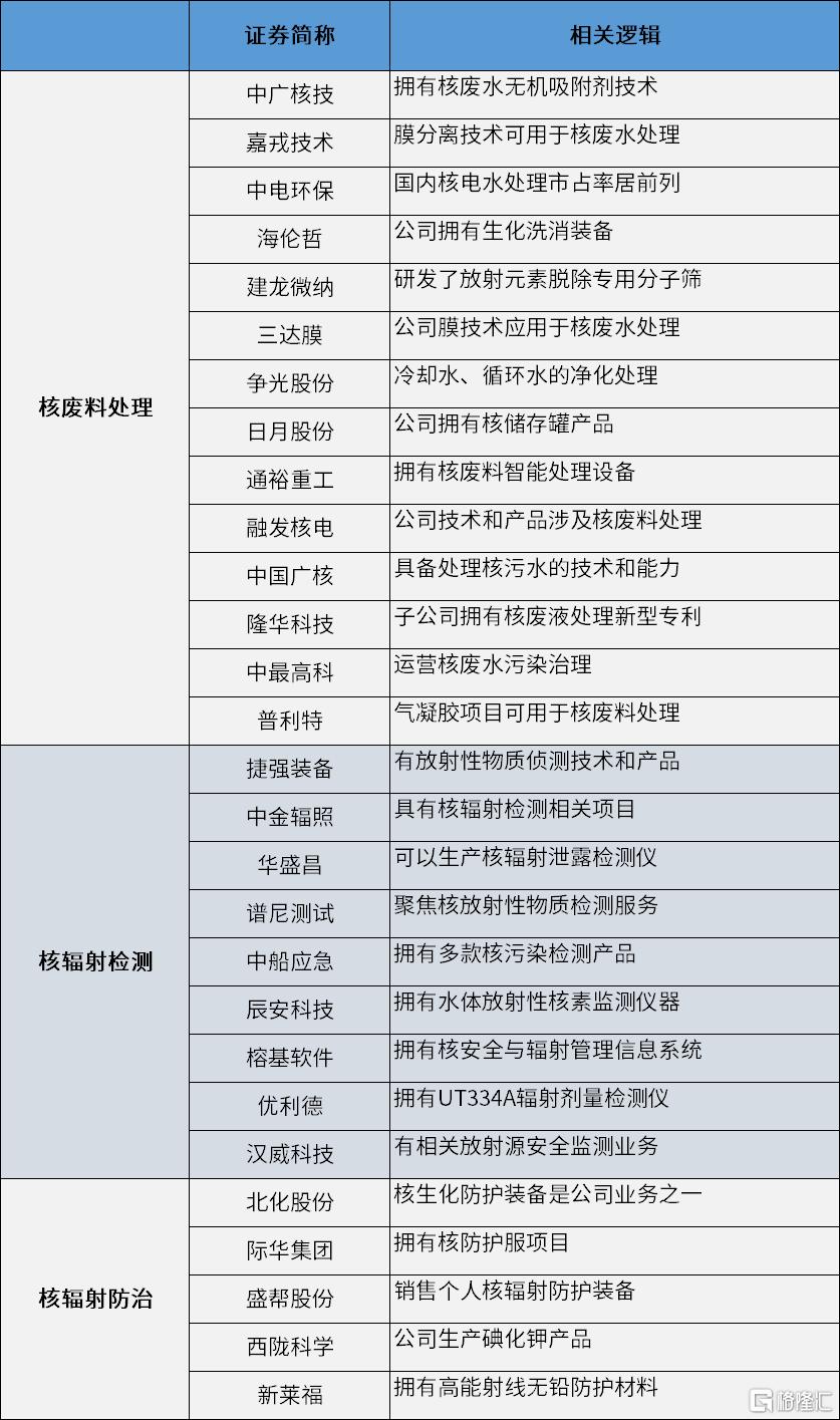 东吴证券指出,2023年8月24日日本启动核废水排海,预计持续30年。经多核素处理系统(ALPS)处理的核废水已去除大部分放射性核素(氚除外),排海的核废水中仍存在氚、碳-14等放射性同位素,或将通过海洋食物链对人类健康带来风险。日本核废水排海,增加了市场对核辐射的担忧,从而提升核污染处理&放射性元素监测相关需求。