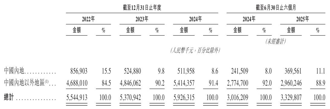 值得注意的是,海外市场是晶晨股份创收的主阵地,2022年、2023年、2024年度和2025年上半年(即“报告期”),来自中国内地以外地区的收入占该公司总收入的比重分别高达84.5%、90.2%、91.4%和88.9%。