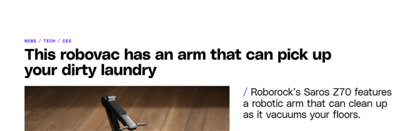 《The Verge》直接在报道标题中称,石头科技的新型扫拖机器人搭配了一个“可以捡起脏衣服的手臂”,并在文章中表示“手臂从G30 Space探索版的中间升起,可以伸出来在清洁地板时拾取袜子和纸巾等物品”。