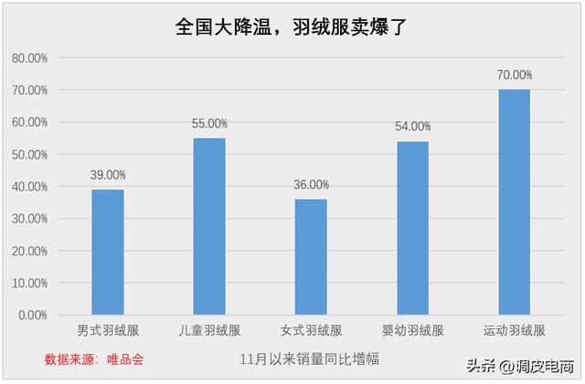 数据显示,该平台11月以来,羽绒服在平台折扣加持下整体销量上涨了两位数,其中最近几年大热的运动羽绒服增幅更是飙升到了70%。品牌中,国民品牌波司登羽绒服近一个月销量也环比有两位数增长,步入销售旺季。有网友的话说得很真实,“唯品会没有全网最便宜的羽绒服,但有全网最便宜的波司登、雪中飞、鸭鸭……”