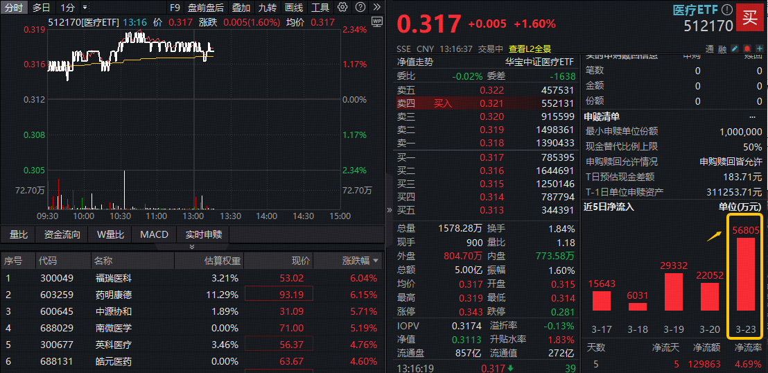 昨日全球市场巨震,医药资产未能幸免,医疗ETF(512170)、港股通医疗ETF华宝(159137)单日跌幅均超4%,收盘价格分别创10个月新低及历史新低,值得关注的是,当日逾5.6亿元逢跌净申购512170,近5日维度,该ETF累计吸金近13亿元。
