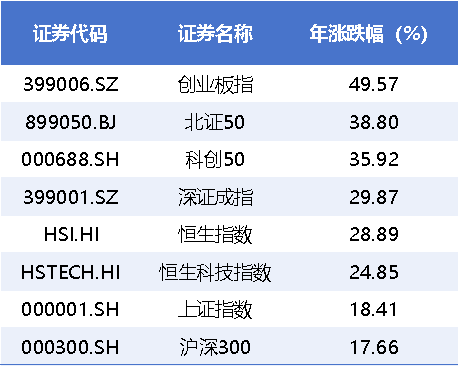 按照惯例,简单做下年终总结,截止今天收盘,创业板指涨近50%,北证50大涨超38%,科创50大涨近36%,深证成指大涨近30%,上证指数、沪深300表现垫底,最惨的是沪深300指数,以均衡自居,结果由于食品饮料仓位过重居然没跑赢上证指数。