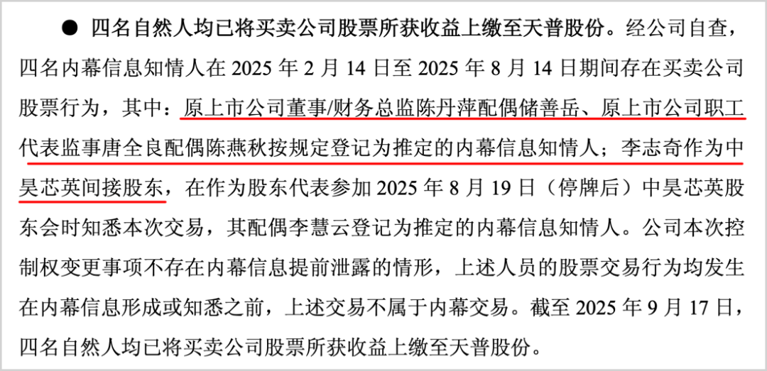 其一是,涉嫌内幕交易,有四名内幕信息知情人员在重组公告发布前突击买入公司股票,不乏财务总监配偶、职工代表监事配偶,而财务总监陈丹萍已突然离职。目前,四人均将股票收益上缴至公司,但这无法排除市场质疑。倘若内幕交易坐实,控制权变更可能直接终止。
