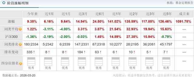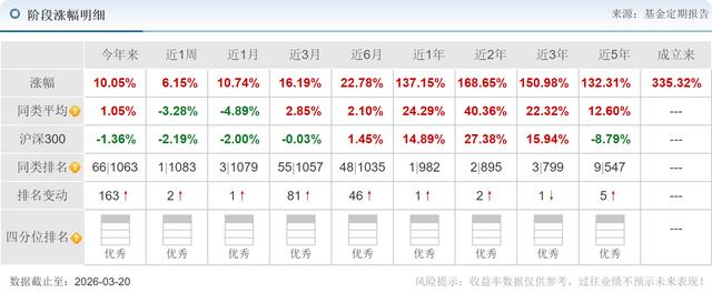 笔者还发现,基金在2025年2季度买入12.50万股的中际旭创,2025年3季度持有20.20万股,2025年4季度持有19.19万股。在基金持有期间,2025年4月1日-2026年3月20日股票价格上涨了523%。笔者发现,基金重仓持有的新易盛、中际旭创等光模块龙头,以及生益科技等PCB和高端制造企业,均受益于AI算力需求的爆发和集成电路产业的升级。这种聚焦集成电路产业的投资策略,使得基金能够充分把握行业风口,实现业绩的快速增长。