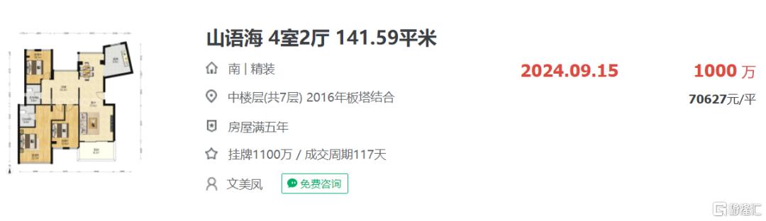 而区域另一二手房小区山语海显示,今年9月成交一套141.59平户型,成交总价1000万/平,折合均价约7.06万/平。